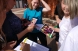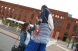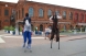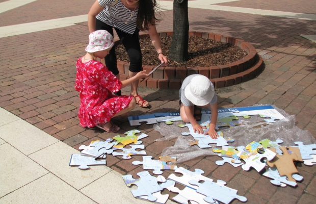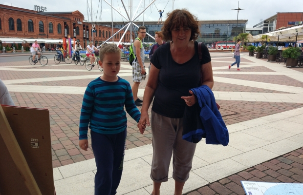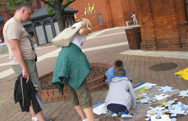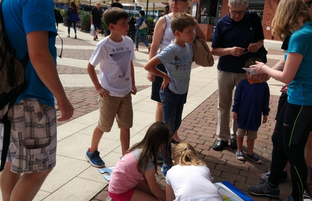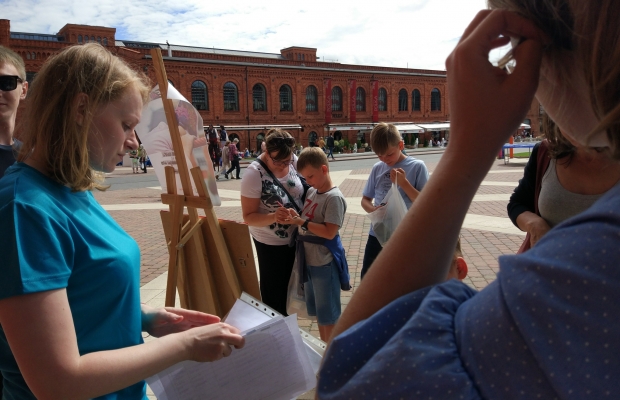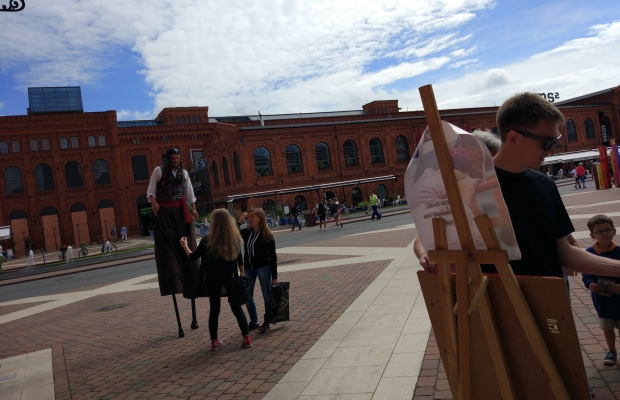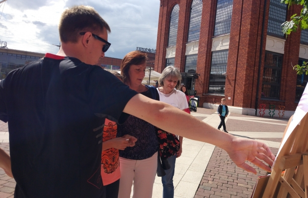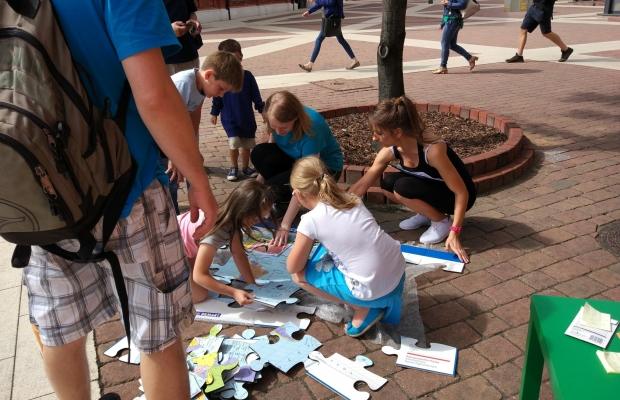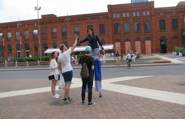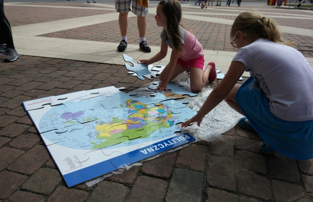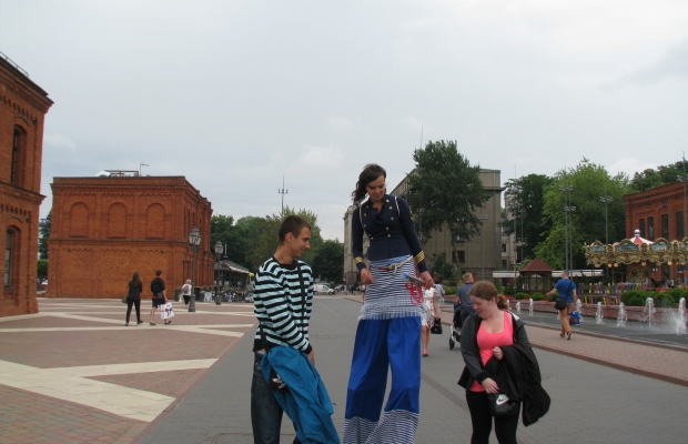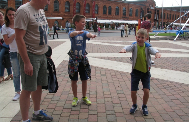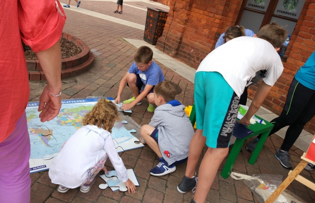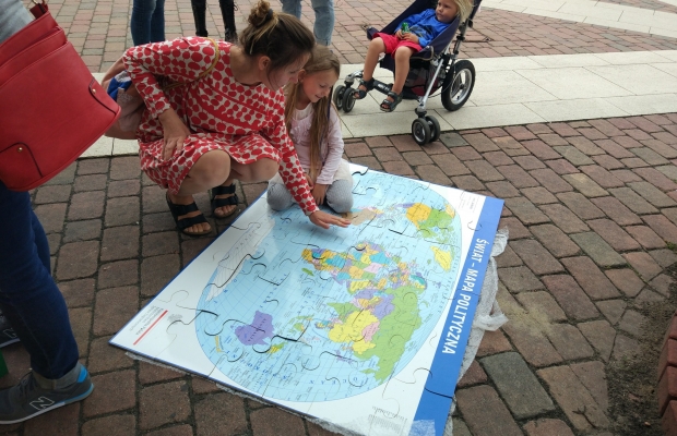 During the event there were different activities to be involved in. Besides questions and board another thing was to tell what country are famous sportsman from the shown pictures from. For kids we brought huge world map so they could do the puzzles. INT team also encouraged people to do some pumps or squats. During whole event two stilt-walker were helping to keep constant interest in the event and pay attention to it.